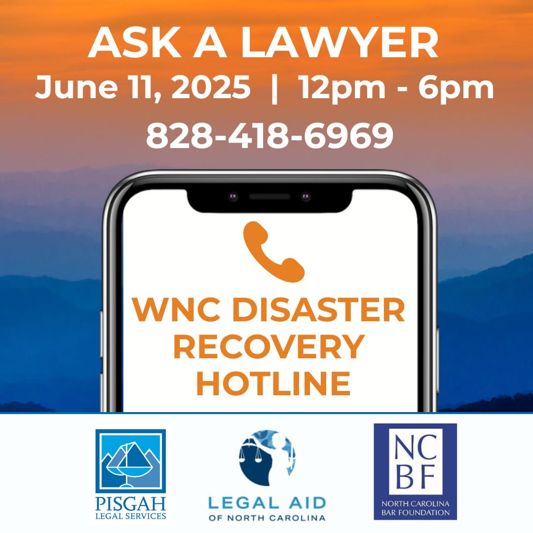 Pisgah Legal Services, Legal Aid of North Carolina, and the North Carolina Bar Foundation are holding an Ask A Lawyer - WNC Disaster Recovery Hotline on June 11, 2025 from 12pm – 6pm. All services are confidential and free. Interpreters are available.